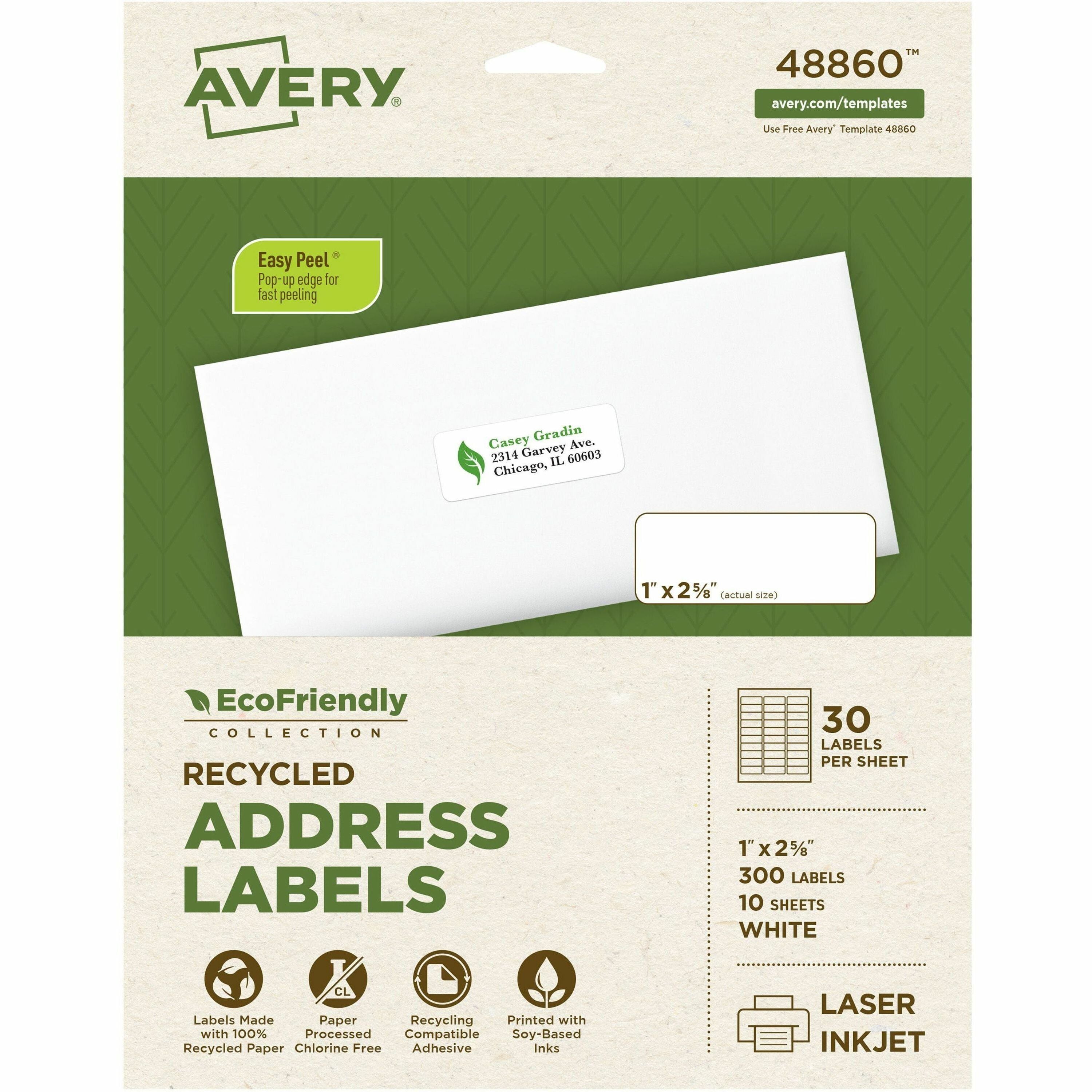 Avery® Eco-Friendly Address Labels for Lfor Laser and Inkjet Printers, 1" x 2?" - 1" Width x 2 5/8" Length - Permanent Adhesive - Rectangle - Inkjet, Laser - Matte White - Matte - Paper - Recyclable, PVC-free, Permanent Adhesive, Customizable, Chlo...