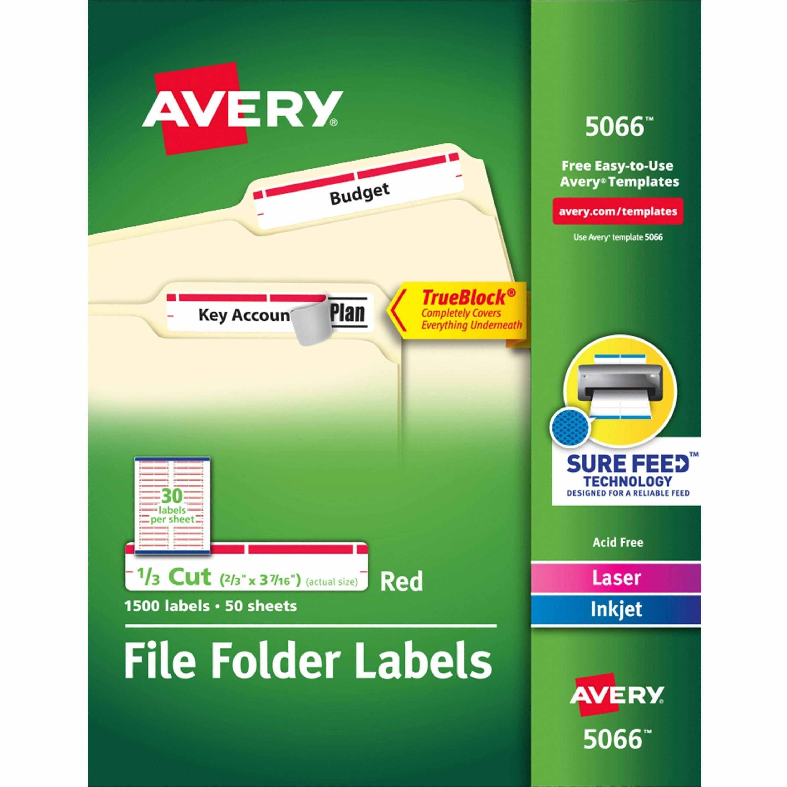 Avery® TrueBlock File Folder Labels - 2/3" Width x 3 7/16" Length - Permanent Adhesive - Rectangle - Inkjet, Laser - Matte - Red - Paper - Permanent Adhesive, Stick & Stay, Jam Resistant, Reusable - 30 / Sheet - 50 Total Sheets - 1500 Total Label(s...