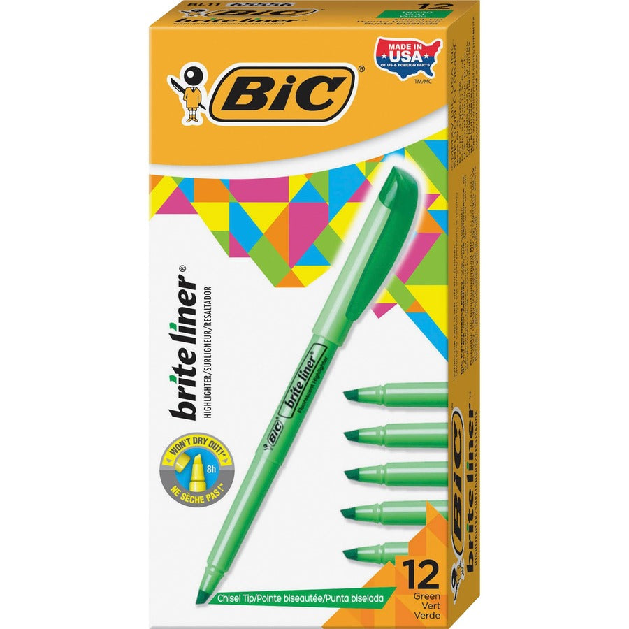 BIC Brite Liner Highlighters - Chisel Marker Point - Fluorescent Green Ink - Water Based - 1 Dozen