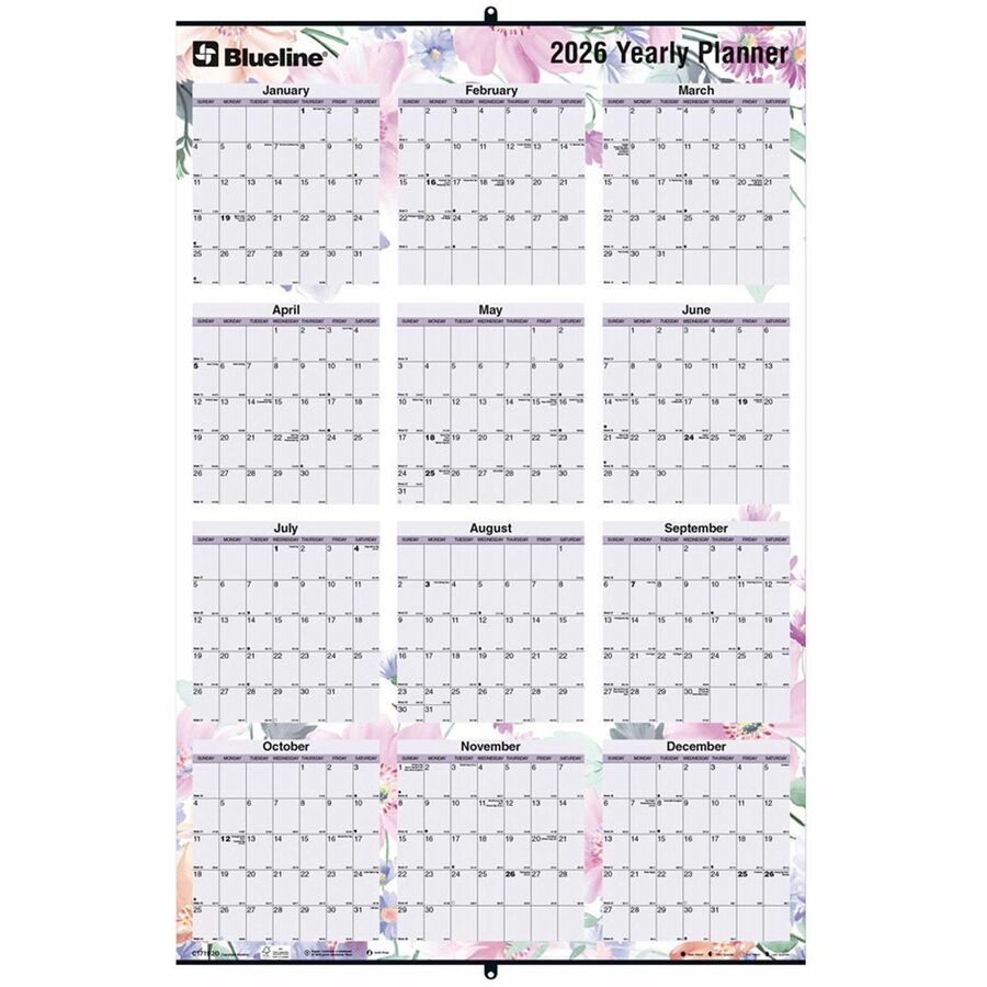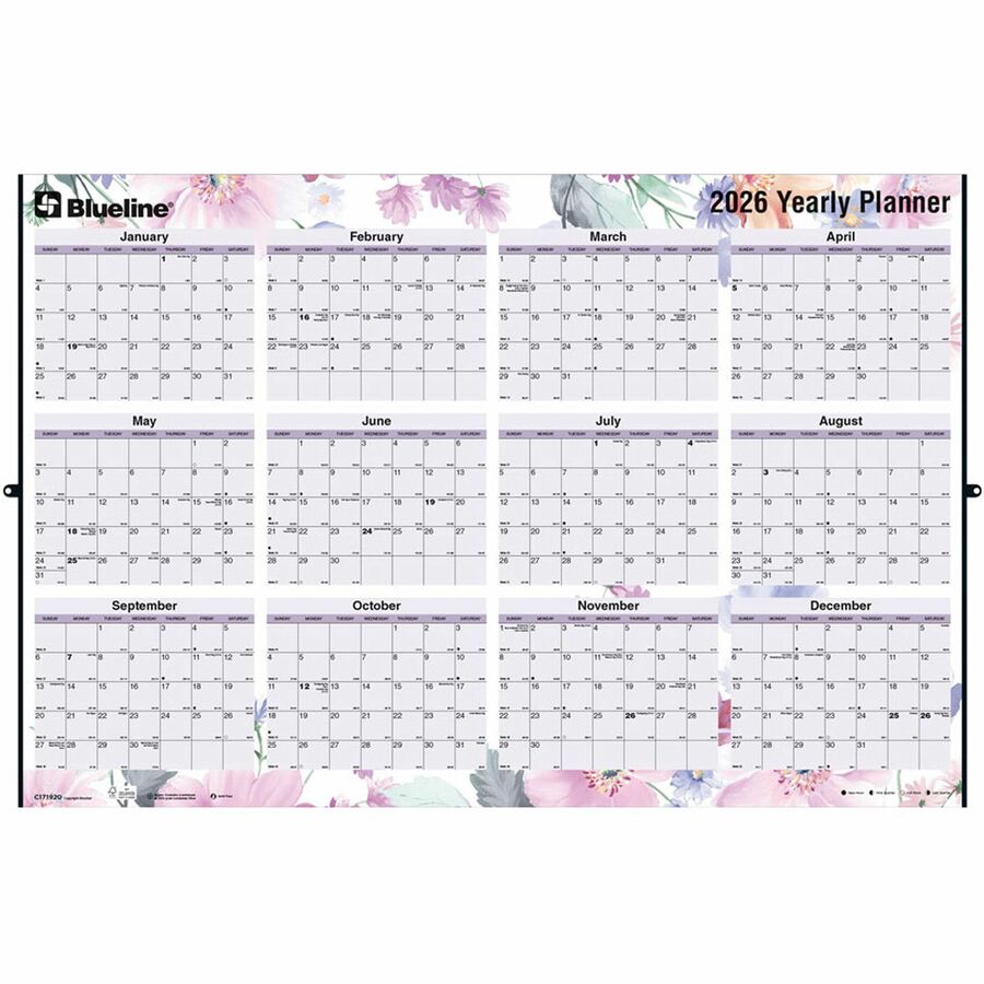 Blueline Passion Yearly Laminated Wall Calendar, 24" x 36" , English - Large - Monthly, Yearly - 12 Month - January 2026 to December 2026 - 36" x 24" Sheet Size - Wall Mount - Metal - 3" Height x 3" Width - Yearly Calendar, Laminated, Eyelet, Hanging H...