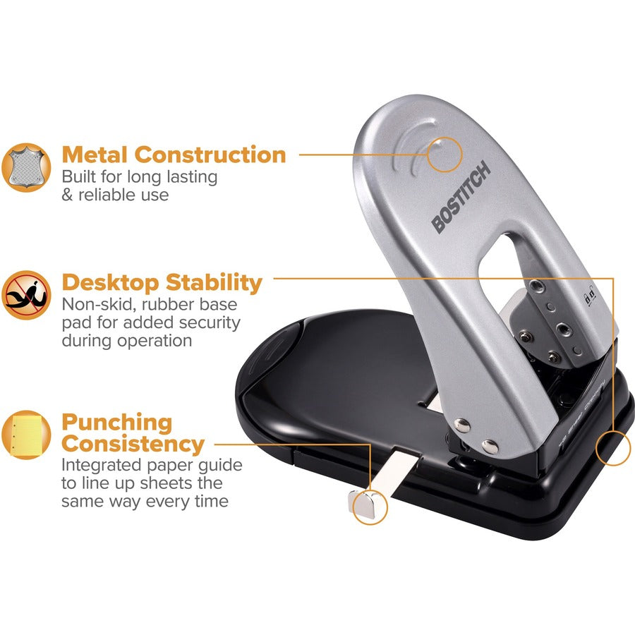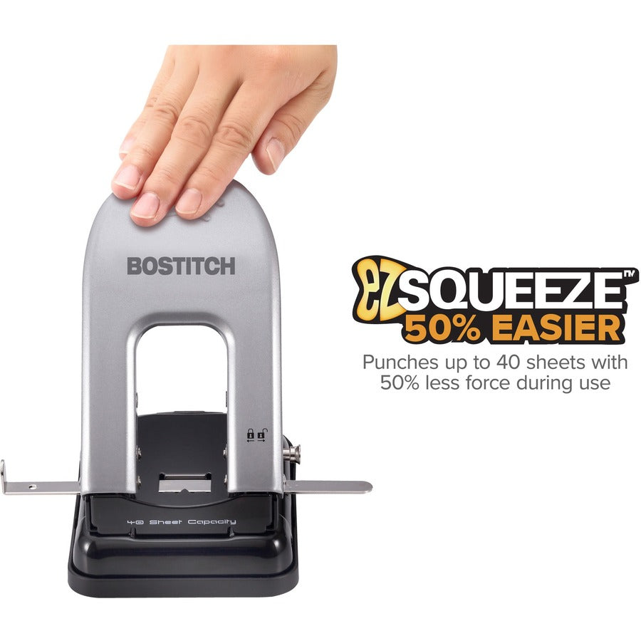 Bostitch EZ Squeeze™ 40 Two-Hole Punch - 2 Punch Head(s) - 40 Sheet - 9/32" Punch Size - 6.5" Width x 2.8" Height - Black, Silver