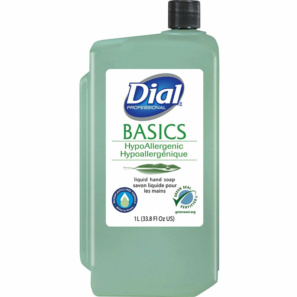 Basics Liquid Hand Soap Refill features a mild, hypoallergenic, liquid lotion formula that is gentle on the skin. With its rich look and feel, this soap is perfect for any commercial setting including healthcare facilities, schools, offices, restaurants, daycare centers and more. Dermatologist-tested, Green Seal certified formula nourishes and helps soothe dry skin. It is free of microplastics, plastic pieces smaller than 5mm. Liquid soap is designed to refill Dial 1 Liter Soap Dispensers (not included).