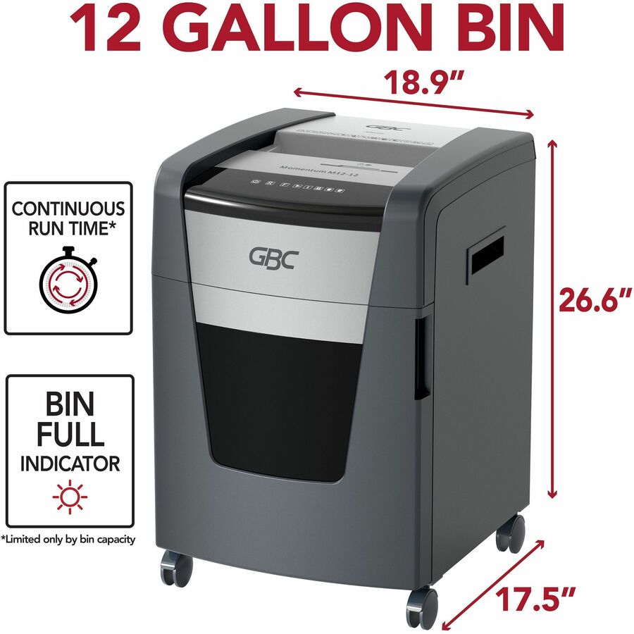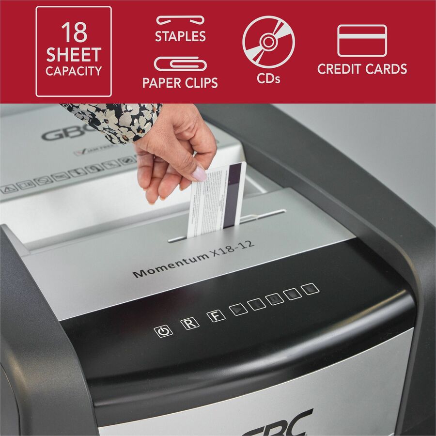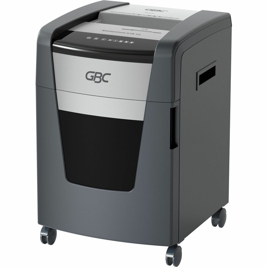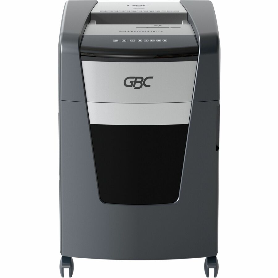GBC Momentum Paper Shredder, X18-12, Micro-Cut, P-4, Anti-Jam, 18 Sheets - Continuous Shredder - Micro Cut - 18 Per Pass - for shredding Paper Clip, Paper, Junk Mail, Staples, CD, Credit Card - P-4 - 9" Throat - 4 Hour Run Time - 7 gal Wastebin Capacit...