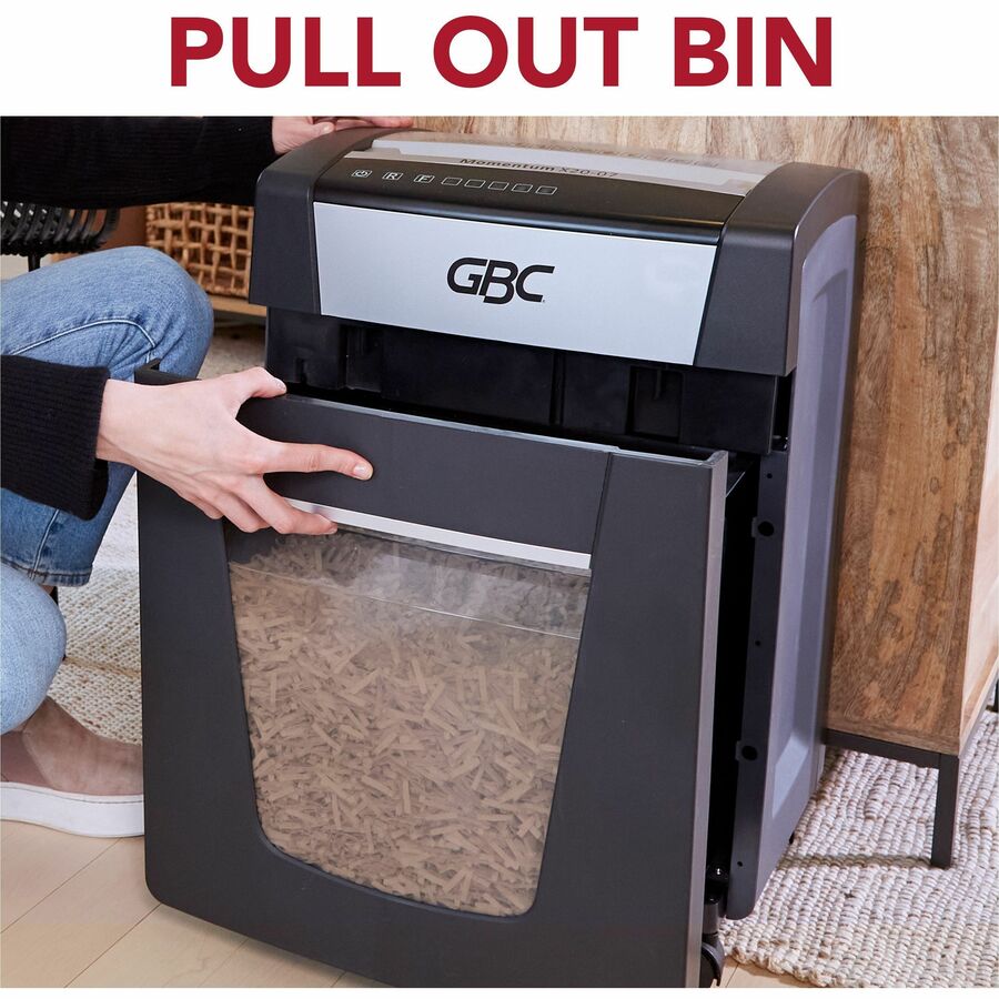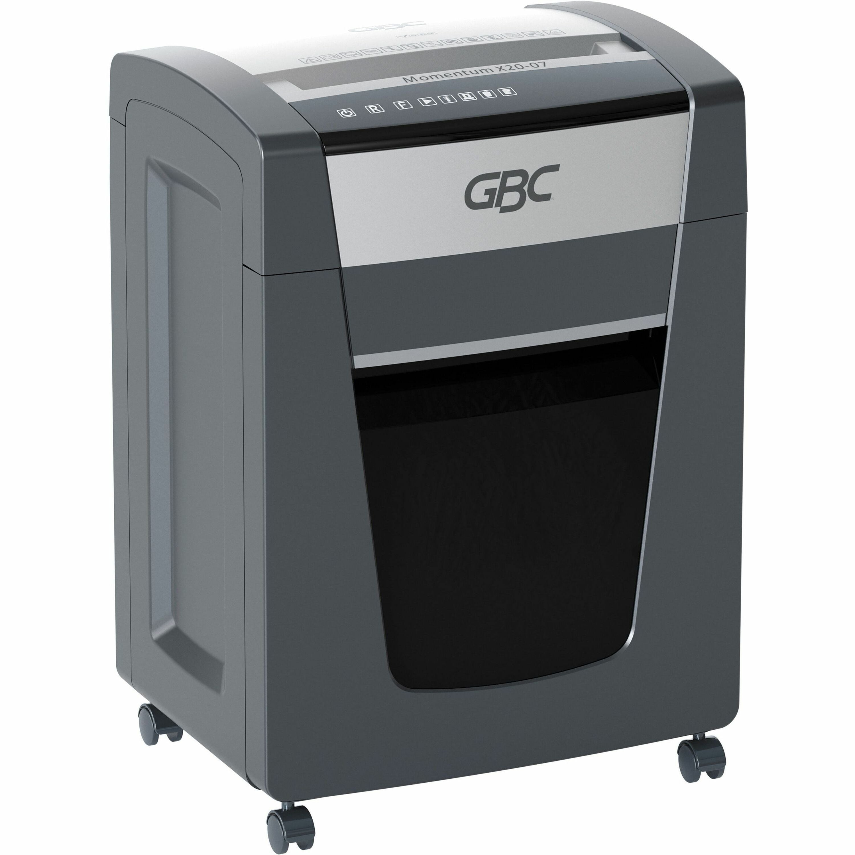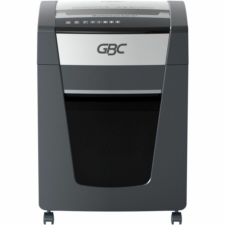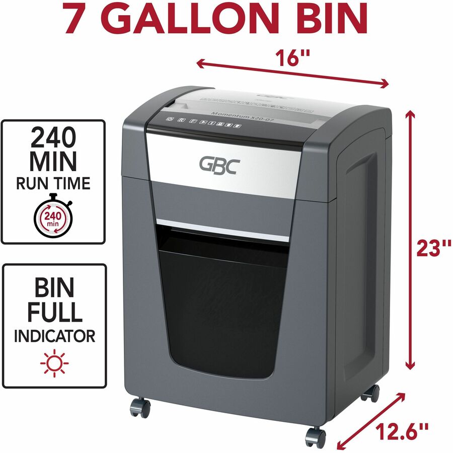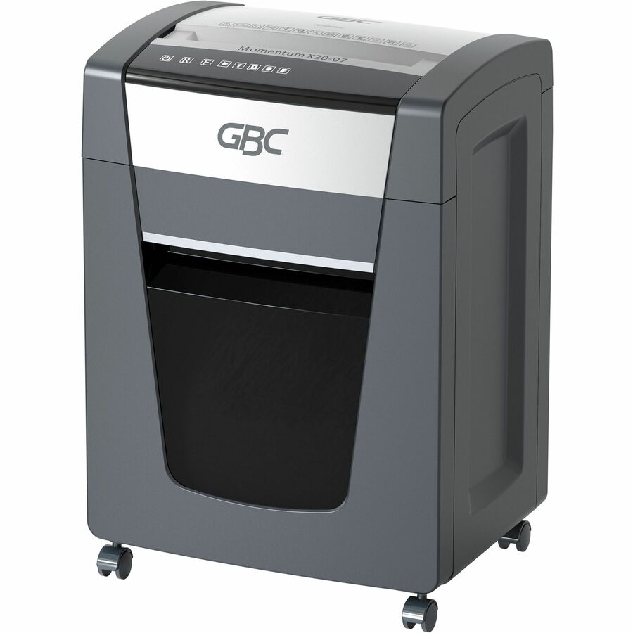 GBC Momentum Paper Shredder, X20-07, Micro-Cut, P-4, Anti-Jam, 20 Sheets - Continuous Shredder - Micro Cut - 20 Per Pass - for shredding Paper Clip, Paper, Junk Mail, Staples - P-4 - 9" Throat - 4 Hour Run Time - 7 gal Wastebin Capacity - Black
