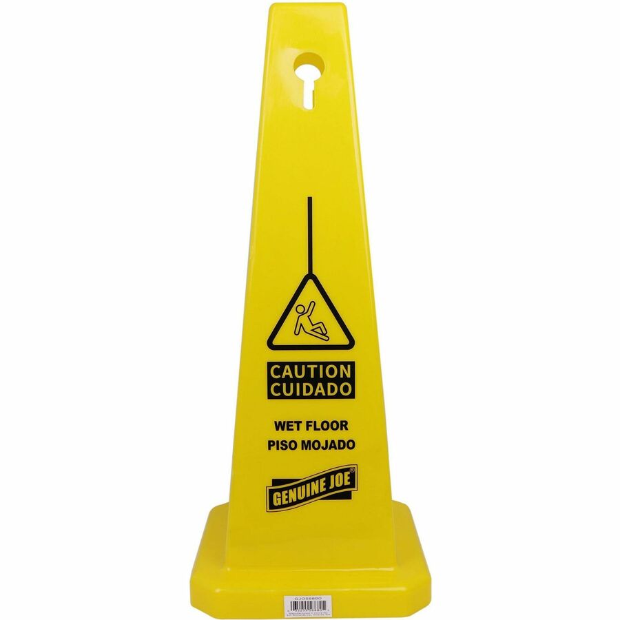 Genuine Joe Bright 4-sided Caution Safety Cone - English, Spanish - 10" Width x 24" Height x 10" Depth - Cone Shape - Stackable - Industrial - Polypropylene - Yellow - 1 Each