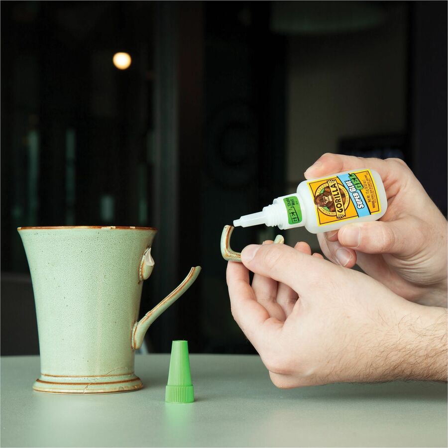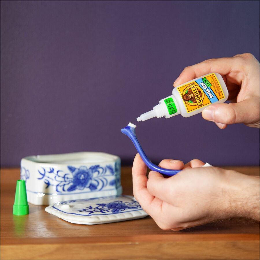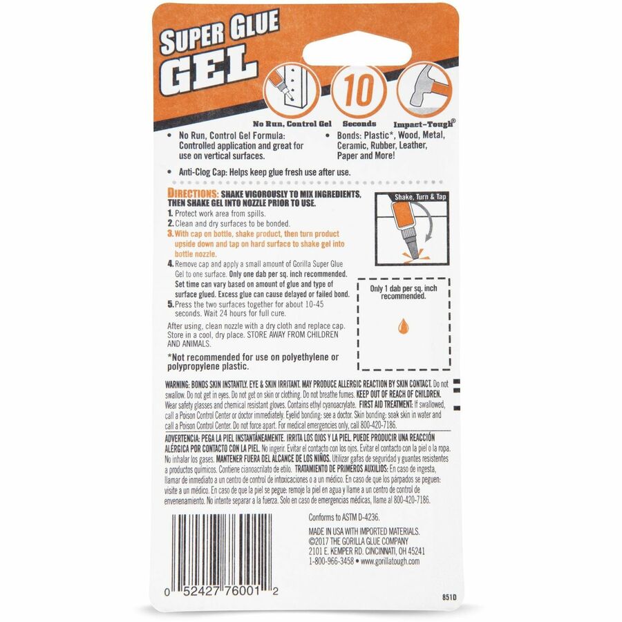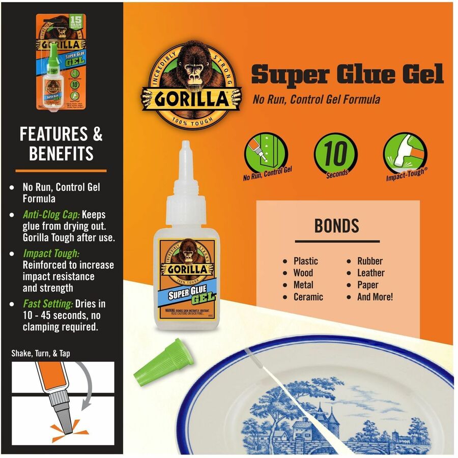 Super glue gel features an easy-to-use, thick formula that clings to surfaces for controlled application on vertical surfaces. Heavy-duty formula offers increased impact-resistance and strength to provide a lasting bond. Anti-clog cap contains a metal pin inside that creates an airtight seal for maximum reusability. Fast-setting design dries in under 45 seconds without any clamping required. Super glue is perfect for plastic, metal, fabric, stone, ceramic, paper, rubber and more.