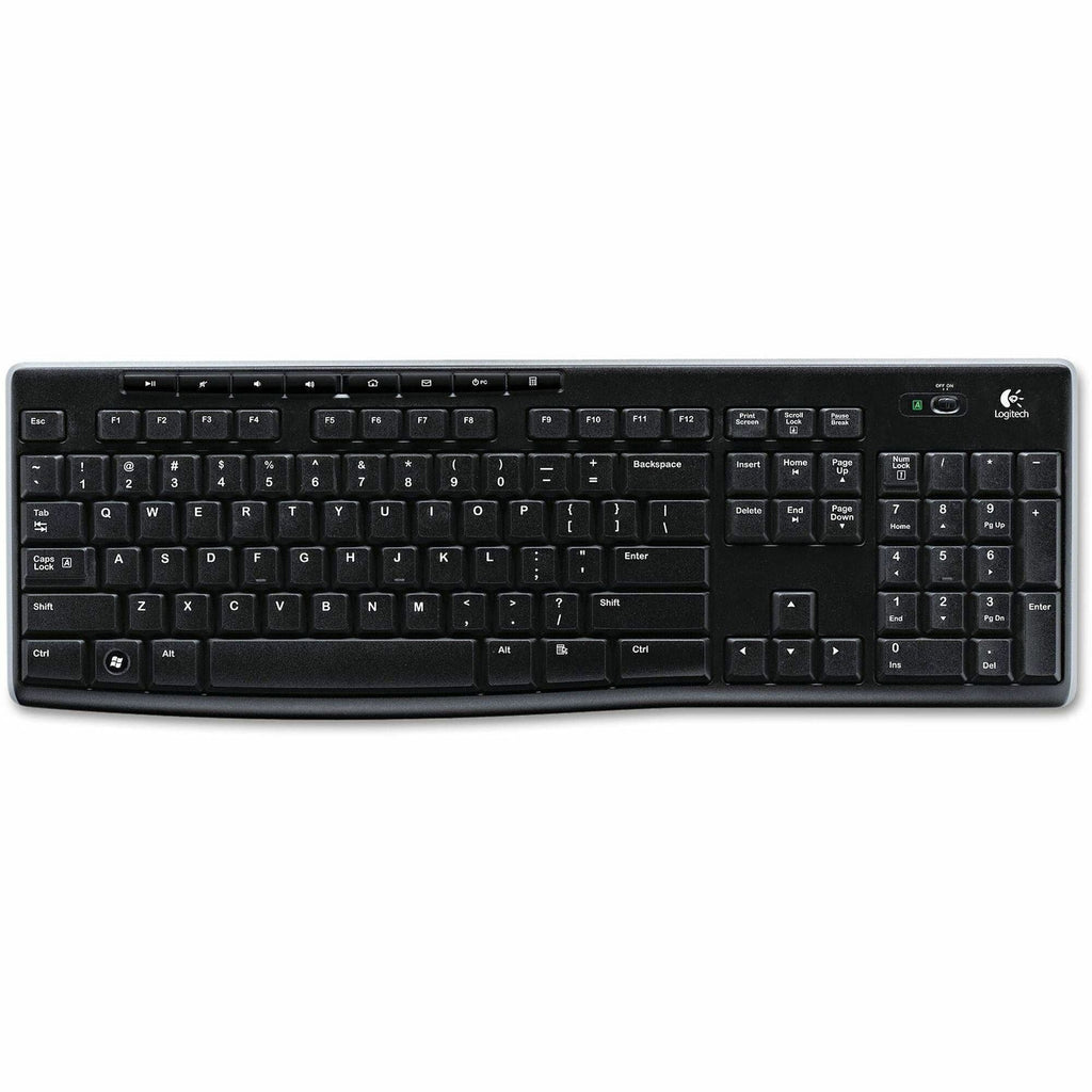 Logitech Wireless Keyboard K270. Reliable wireless-wherever you use your keyboard. The tiny Logitech Unifying receiver is small enough to stay in your laptop. Plus, you can easily add another compatible mouse or keyboard-without the hassle of multiple USB receivers. With Logitech Advanced 2.4 GHz wireless connectivity, you'll enjoy virtually no signal loss from up to 10 meters away.* You can go for two years without battery hassles.** Eight hot keys and plug-and-play setup that takes just seconds add to the simplicity. The familiar, full-size layout-including number pad-gives you all the right keys right where you'd expect them. And it's built to last with the high quality and reliability Logitech is known for-with a spill-resistant design*** and UV-coated keys for durability. * Wireless range may vary due to environmental and computing conditions. ** Keyboard battery life calculation based on an estimated two million keystrokes/year in an office environment. User experience may vary. *** Tested under limited conditions (maximum of 60 ml liquid spillage). Do not immerse keyboard in liquid.