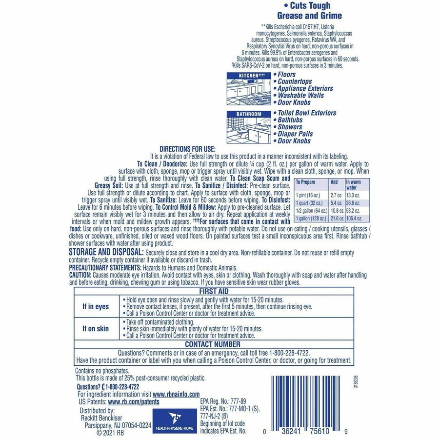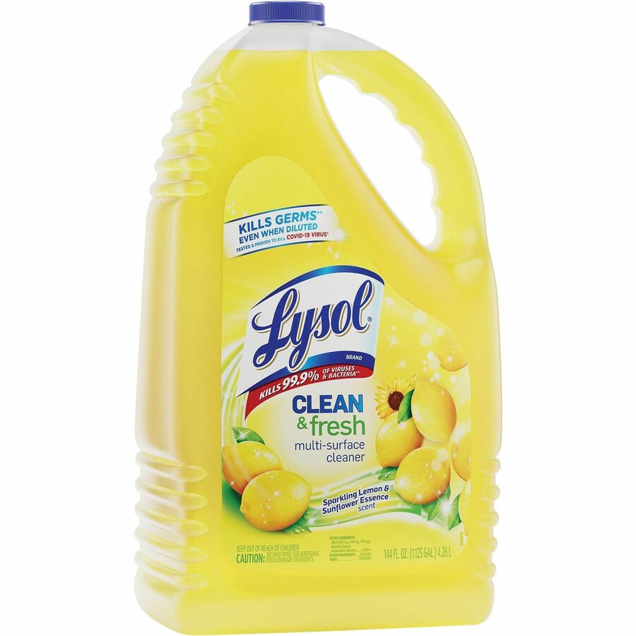 Help protect your workplace against viruses and bacteria with this versatile, concentrated, Lysol Pourable Multi-Surface Cleaner. Broad-spectrum disinfectant kills germs, including cold and flu viruses, RSV, E. coli, Salmonella and the virus that causes COVID-19 on hard, nonporous surfaces when used at full strength or diluted. Give cleaning crews the ability to cut through tough grease, grime, soap scum and daily messes with a multisurface formula that works in spray bottles and mop buckets. All-in-one design works as a disinfectant, restroom cleaner and floor cleaner to clean high-touch surfaces in breakrooms, classrooms, guest/resident rooms, manufacturing areas and work spaces. Concentrated formula makes up to 288 spray bottles of 32 oz. cleaning solution and delivers a pleasant scent.