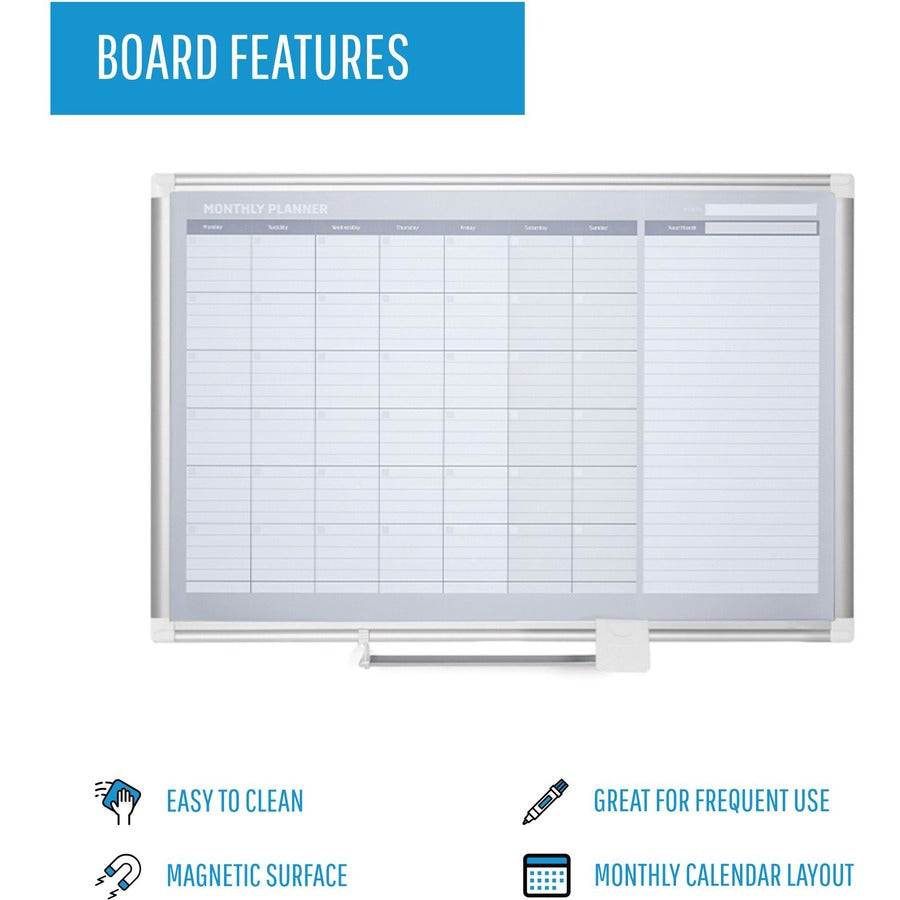 Monthly planner offers the perfect planning and presentation solution, suiting all office needs. Magnetic Gold Ultra dry-erase surface is scratch-resistant and ghost-resistant. Calendar is ideal for managing teams and schedules with ample room for any month. The write-on/wipe-off month features ruled daily blocks, Monday-through-Saturday scheduling, shaded weekends and a ruled notes column. Modern, sturdy aluminum frame allows the board to fit any environment, and a sliding pen tray keeps all accessories close at hand. Dry-erase planner includes a wall-fastening kit.