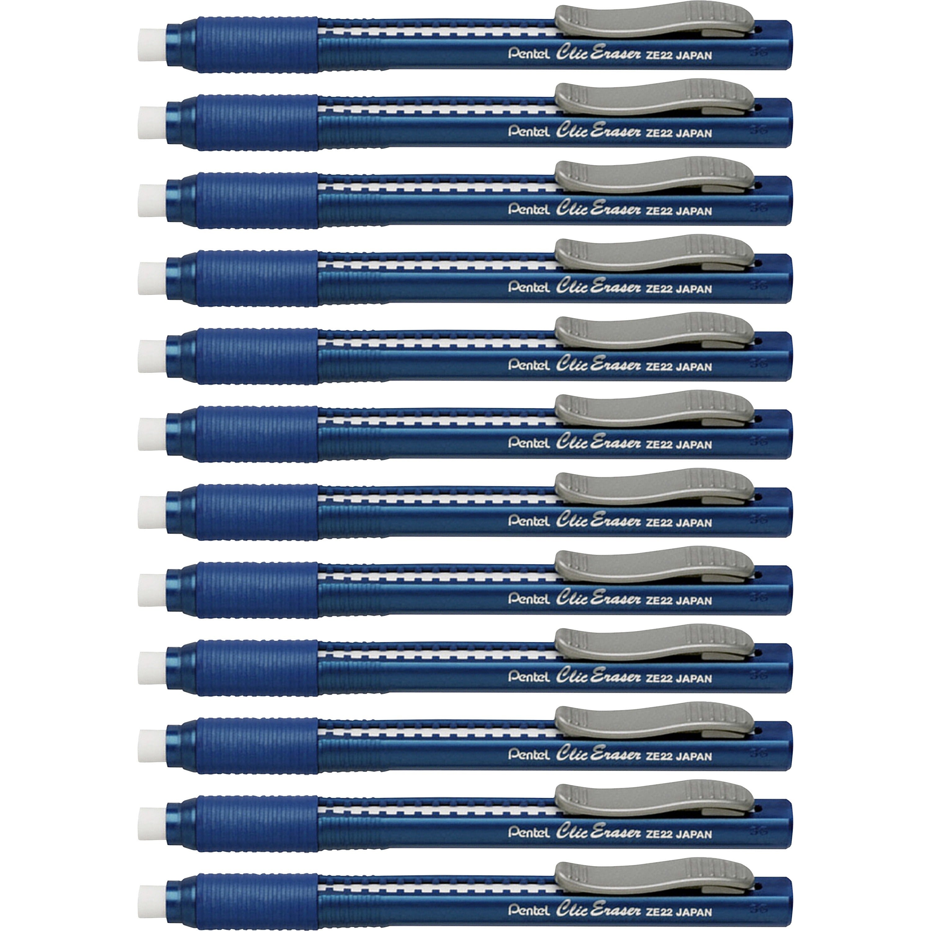 Pentel Rubber Grip Clic Eraser - Blue Barrel - Pen - Refillable - 12 / Box - Retractable, Latex-free Grip, Pocket Clip, Ghost Resistant, Non-abrasive