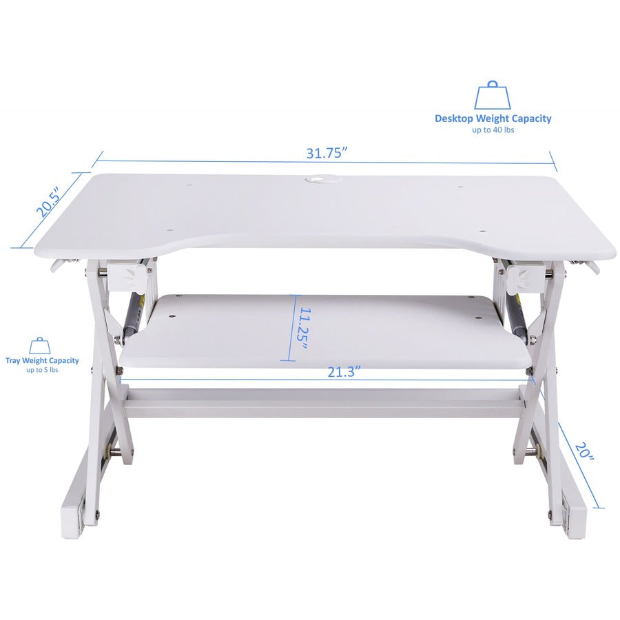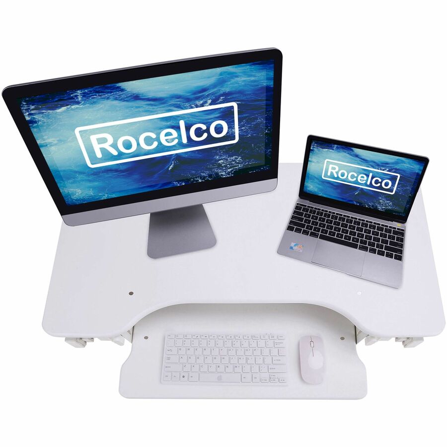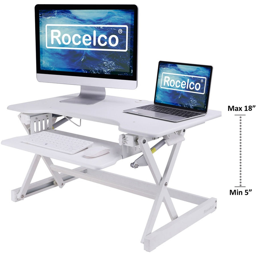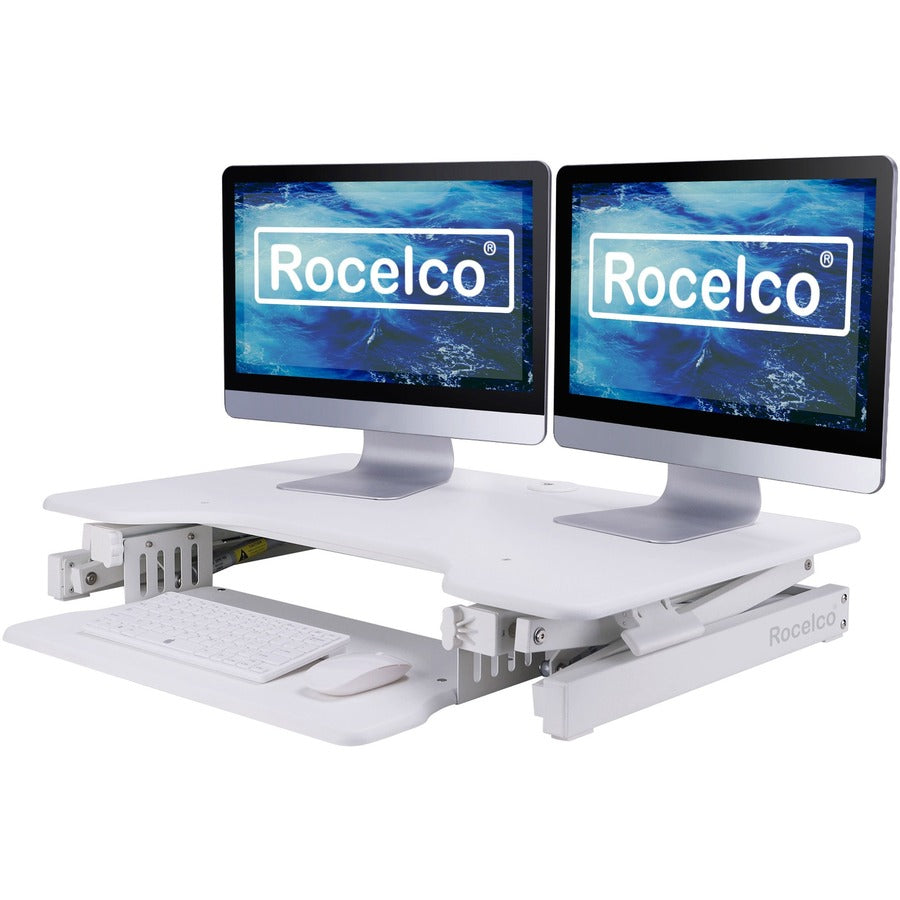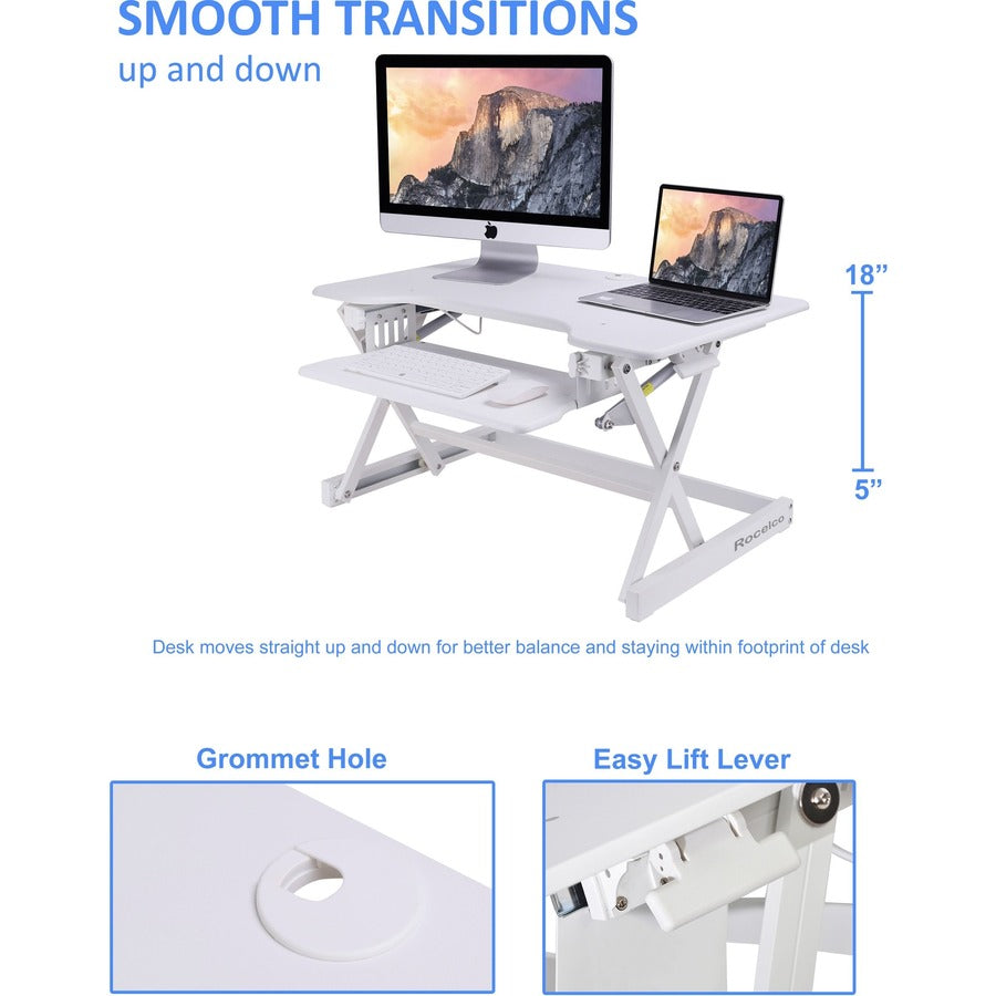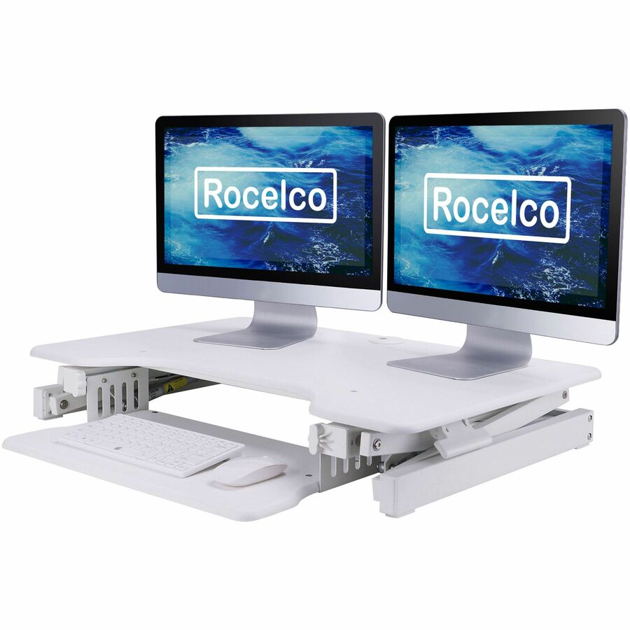 The Rocelco EADRW Height Adjustable Sit to Standing Desk Riser and Converter offers the versatility you need to get through your work day. Now you can sit part of the day or stand to take advantage of all the health benefits that come with standing and moving around. With the EADRW2, you and your associates will become healthier and more productive. It fits over your current desk with no need to buy additional furniture. LARGE WORK SURFACE: 32" wide by 20.5" deep desktop that holds up to two 24" monitors or one 32" monitor and retractable keyboard tray is 21" wide by 11" deep RETRACTABLE ERGONOMIC KEYBOARD TRAY: 4.5" spacing between keyboard tray and desktop keeps monitor at proper ergonomic height to prevent neck strain while sitting or standing, keyboard tray extends for optimum comfort. Large 21" x 11" keyboard tray size will hold a laptop if needed. EASY HEIGHT ADJUSTMENT WITH EVR ENHANCED VERTICAL RANGE: Sturdy metal frame with easy-grip side handles and gas piston assist, can raise and lower up to 35 lbs., with continuous height adjustment from 5" up to 18" above desktop to optimize the ergonomic work position for people of all heights. Straight up and down motion minimizes required depth (21"). GROMMET HOLE: For hassle free cable management, or to install a monitor mount for 1 or 2 monitors, such as the Rocelco DM1 or DM2. NO ASSEMBLY REQUIRED: Simply remove from box and place directly on existing desktop. WARRANTY: Manufacturer Limited 1 YR Warranty HEALTH BENEFITS: Easy and affordable solution to start enjoying the health benefits of standing while you work Licensed under U.S. Patent Nos. 9,113,703; 9,277,809; 9,554,644; 9,924,793 and other pending/issued U.S. and foreign patents.