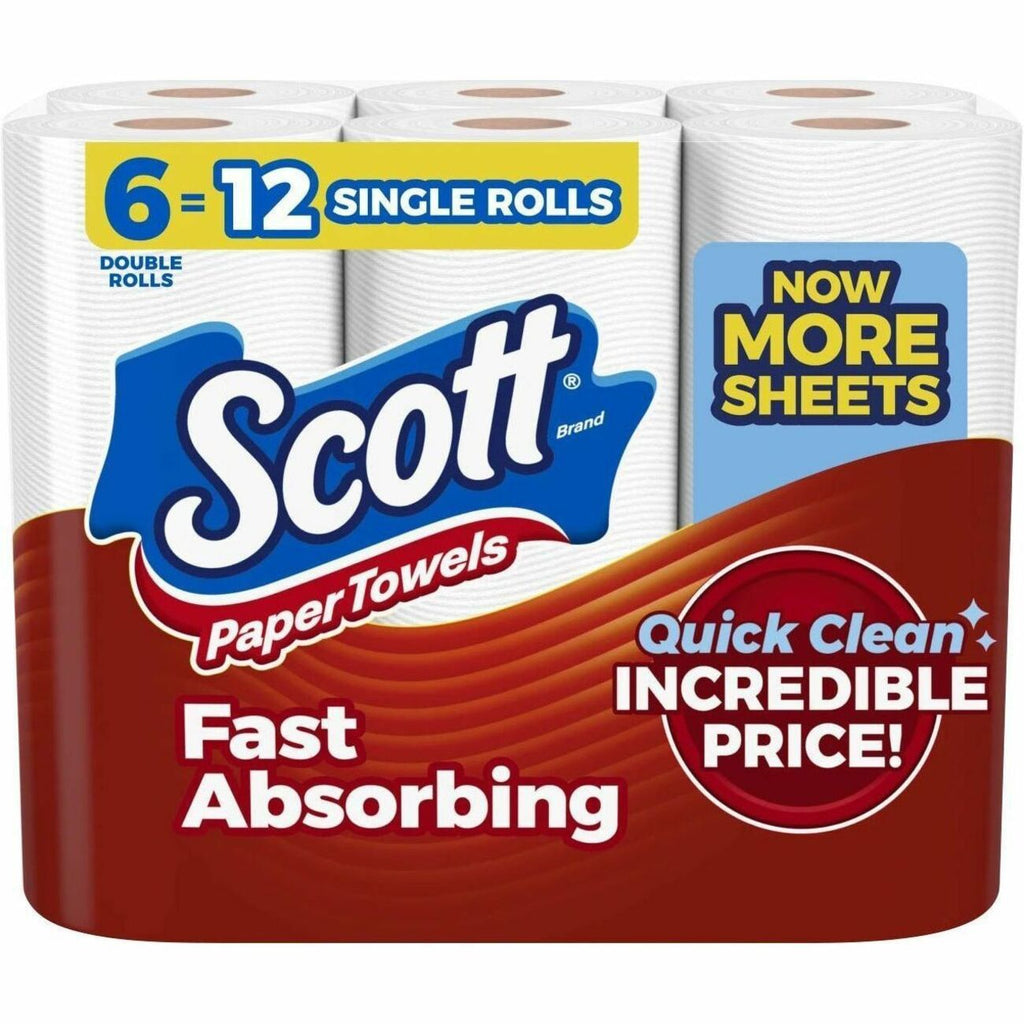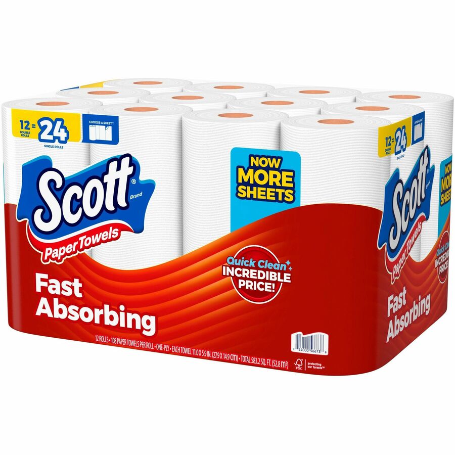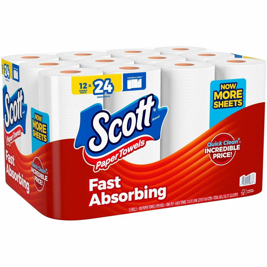 Disposable kitchen paper towels soak up spills quickly with Quick Absorbing Ridges. Scott brand delivers the quality you can rely on. Choose-A-Sheet design allows you to grab exactly what you need to prevent wasteful use. 12 Double Rolls of Scott Choose-A-Sheet equal 24 rolls of standard paper towels. Disposable paper towels are virtually lint-free when you wipe to help you leave any surface spotless. Scott brand paper towels are FSC-certified and have 100 percent paper fibers sourced from responsibly managed forests.