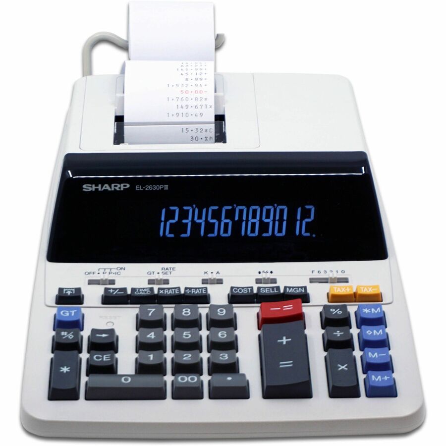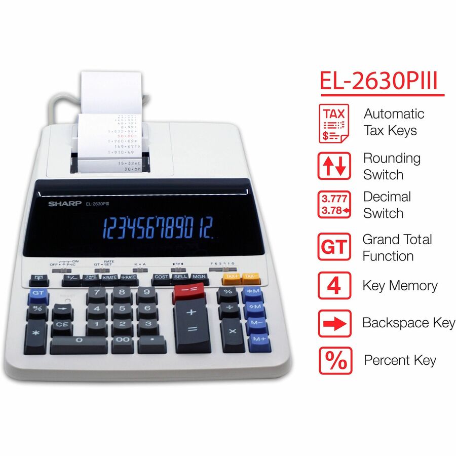 Sharp Calculators EL-2630PIII 12-Digit Commercial Printing Calculator - Independent Memory, Sign Change, Backspace Key, Double Zero, Fixed Decimal - AC Supply Powered - 3.1" Height x 9" Width x 13.2" Depth - Off White - 1 Each