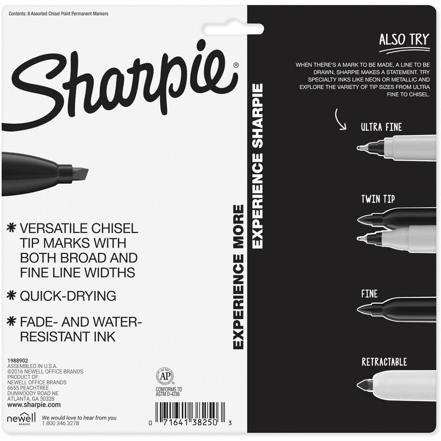 Sharpie Markers feature a unique antiroll barrel design and wide-edged tip for both thick and thin marking lines. Unique non-roll shape provides improved control. The durable tip and ergonomic pen-like shape allow comfortable, versatile use. Marker has a chisel tip and quick-drying, alcohol-based ink formula. Use clip to attach to pockets, notebooks and more. Fade-resistant, water-resistant ink further extends multiple project uses. Markers are certified AP nontoxic.