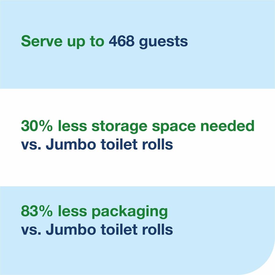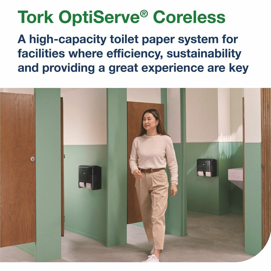 Tork OptiServe® Coreless is a high-capacity coreless toilet paper system for facilities where efficiency, sustainability, and providing a great experience are key. These high-capacity toilet paper rolls serve 468 guests when used with a 4-roll dispenser, reducing bath tissue run-outs and saving staff time on refilling dispensers. Coreless toilet paper reduces waste, as there are no cores or wraps, and these high-capacity rolls have 83% less packing compared to jumbo rolls. Plus, these tubeless toilet paper rolls need 30% less storage than jumbo rolls and they come in Tork Easy Handling packing to make carrying them easier.Advantages at a glance:High-capacity rolls, refill less often and save timeServe up to 468 guests when used with a 4-roll dispenser2-ply, perforated toilet paper is easy to tearNo core and no wrap mean less waste83% less packaging versus jumbo rolls30% less storage space needed versus jumbo rollsTork Easy Handling® packaging for ergonomic carrying