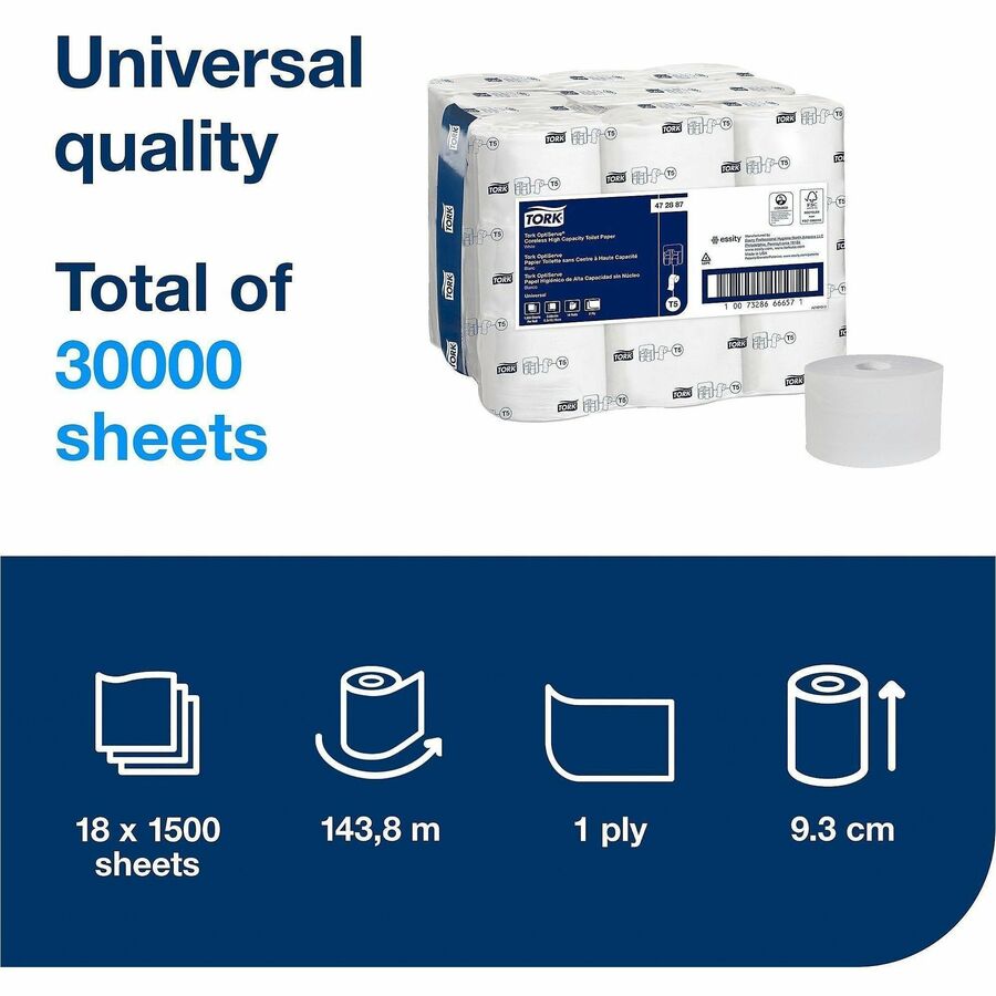 TORK OptiServe High Capacity Coreless Toilet Paper White T5 - 2 Ply - 3.70" Width x 500 ft Length - White - 1500 Sheets - 18 / Carton