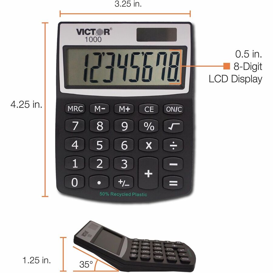 Victor 1000 Mini Desktop Calculator - Large LCD, Battery Backup, Independent Memory, Plastic Key, Dual Power - 0.71" - 8 Digits - LCD - Battery/Solar Powered - 0.5" Height x 3.3" Width x 4.3" Depth - Black - Plastic - 1 Each