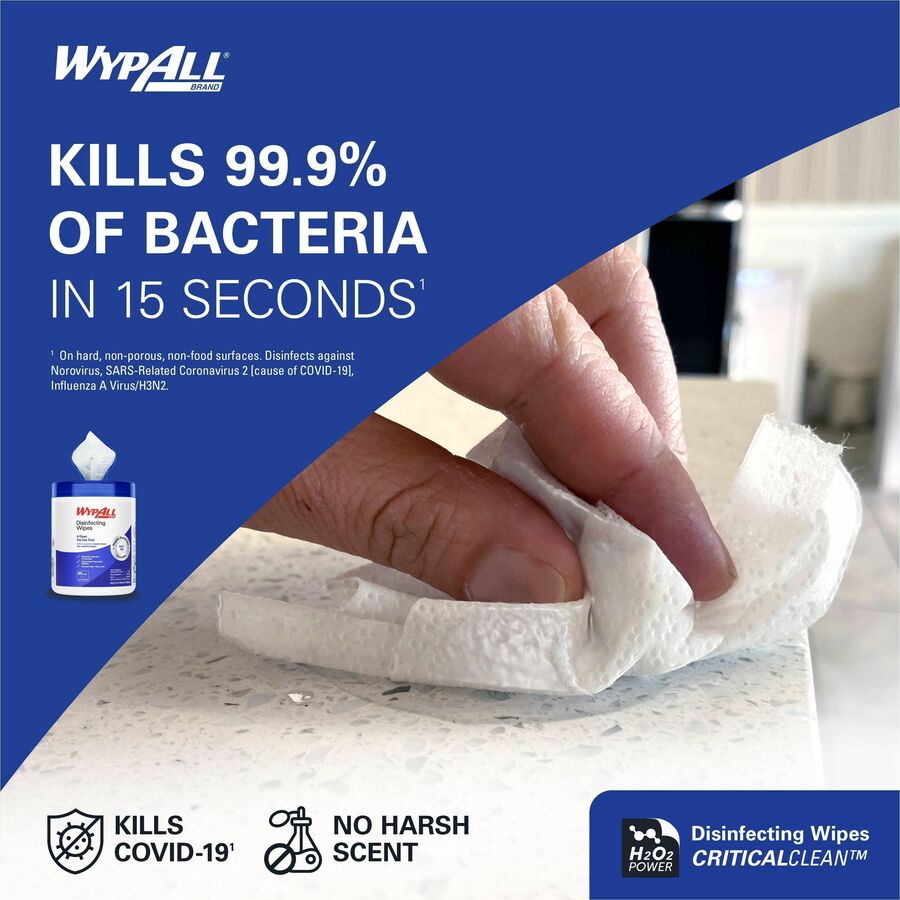 Disinfecting wipes offer a clean you can trust with chemicals you can pronounce. Clean, fresh-scented formula is activated with hydrogen peroxide, killing pathogens such as Norovirus and COVID-19 virus. Active ingredient biodegrades into water and oxygen. They are approved to use in commercial, industrial and healthcare settings. Wipes meet the lowest EPA-defined human toxicity levels for disinfecting wipes so they can be labeled without "Hazards to Humans" or "Wash Hands After Use" warnings typically noted on the vast majority of disinfecting wipes canisters. They are eligible to be recycled (when used in non-hazardous applications as classified by federal, state and local regulations) via Wipes Recycling through RightCycle by Kimberly-Clark Professional, a manufacturer-led wipes recycling program. Disinfecting wipes come in canisters for efficient storage that makes it easier to handle for your people and the planet.